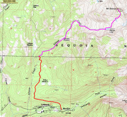 We started at Lodgepole (6700ft) and hiked up the Twin Lake trail. After 2.1 miles, we left the trail just where it crosses Silliman Creek. There is a good use trail starting there, although the start is not obvious from the main trail. (In the way back, we found out that a much better use trail leaves the main trail at the bottom of the switchbacks located just before the point where the trail crosses Silliman Creek.) We proceeded to Silliman Meadows where there are good campsites and up to an unnamed meadow at about 9000ft. This unnamed meadow would be also a good place to camp, although water may be scarce late in the season.